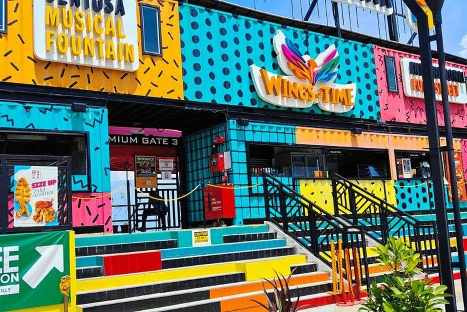 5. Dîner au Central Beach Bazaar – Explorez et dînez librement dans le bazar gastronomique de votre choix. 6. Wings of Time – Assistez au célèbre spectacle nocturne de Singapour en bord de mer, avec feux d'artifice et effets lumineux. 7. Sentosa Sensoryscape – Terminez votre visite par une promenade relaxante dans ce jardin immersif de sons et de lumières.
